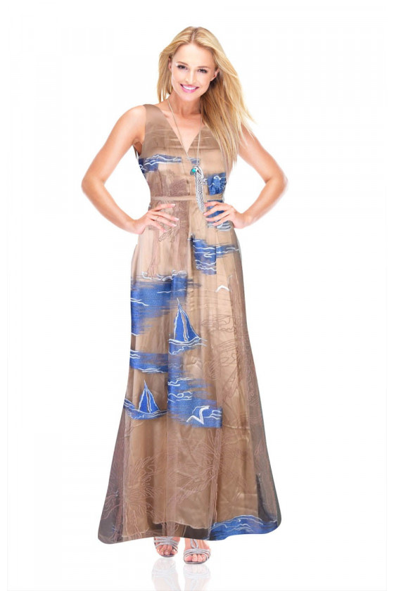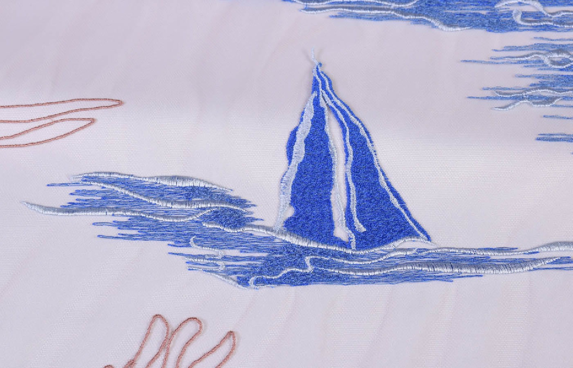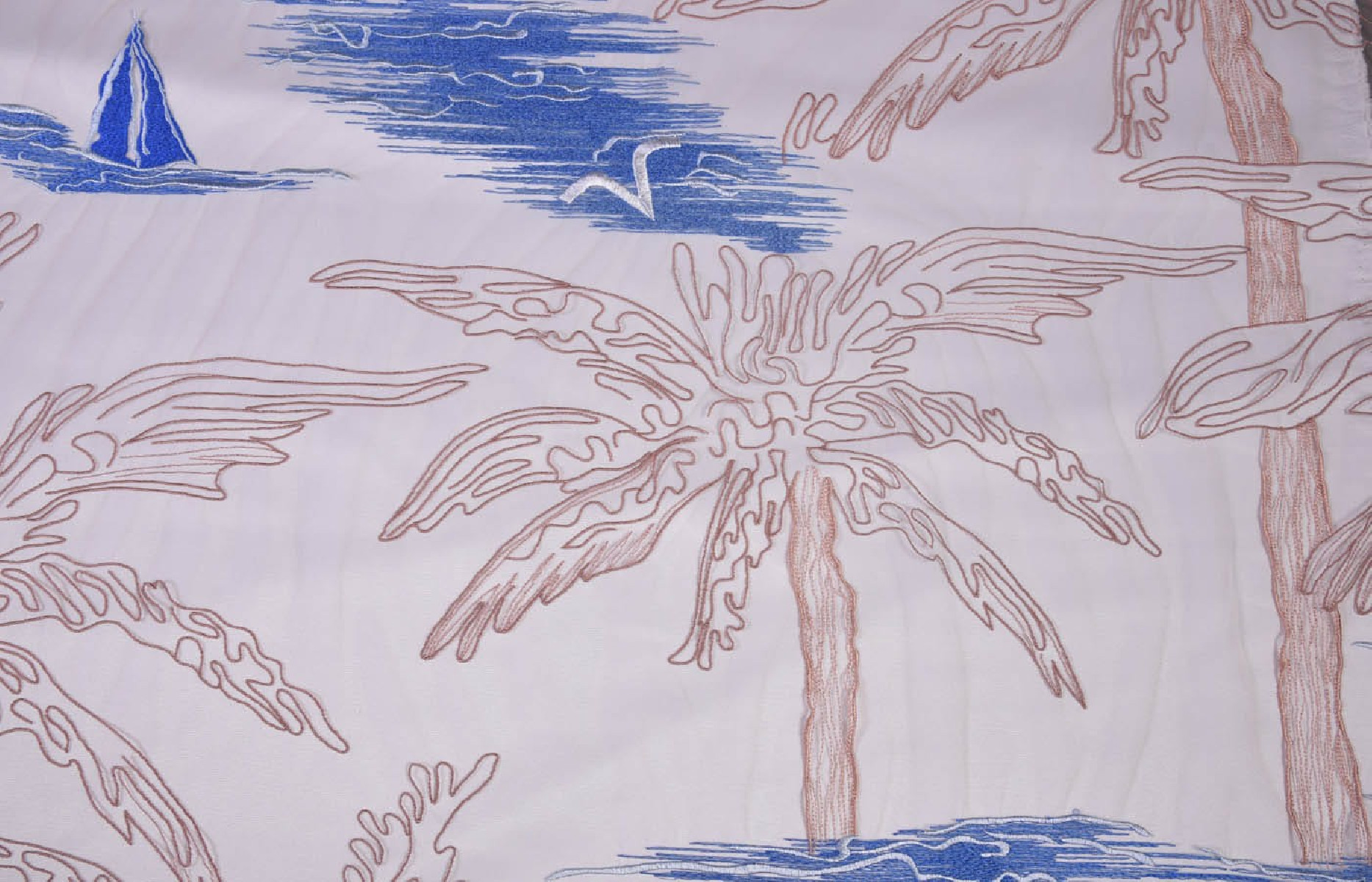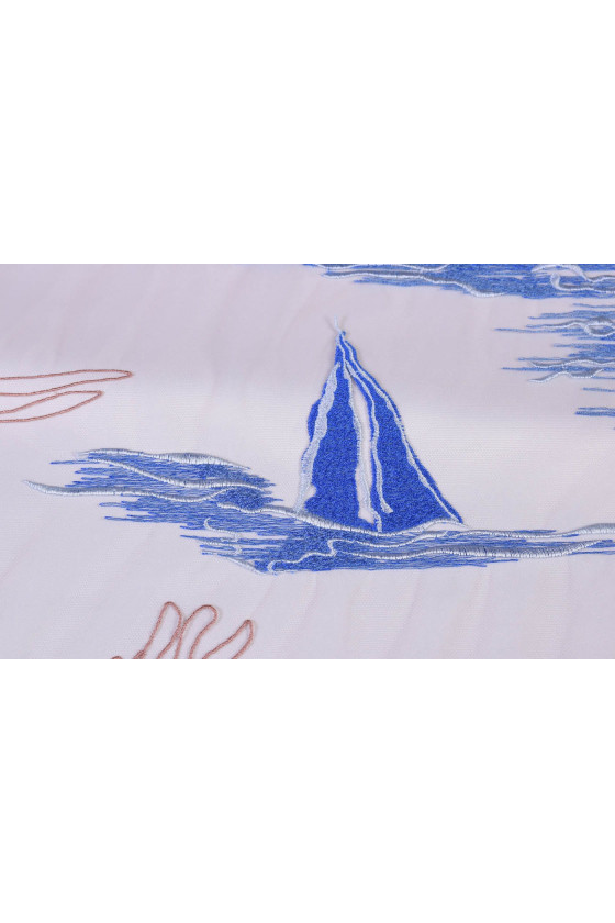 Interesants priekšlikums par izšūtu tilla (parakstītu audumu) palmu, jūras un buru laivu svētku motīvā. Ideāli piemērots kleitām vai blūzēm.