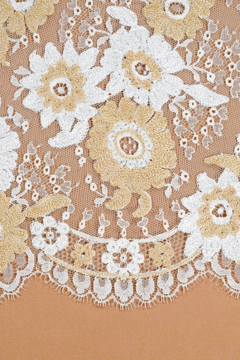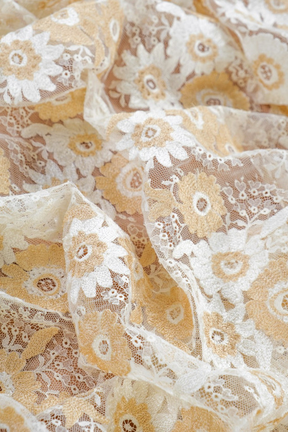 80 cm platas mežģīnes ar izšūtiem ecru ziediem un smilškrāsu. Mēs iesakām to korsešu, blūžu vai ieliktņu šūšanai. Tas lieliski sader ar zīda satīnu.