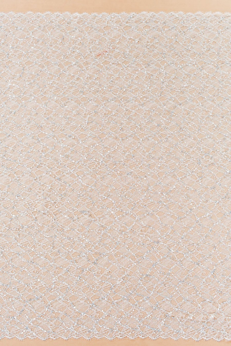 Plānas, maigas mežģīnes pelēkā sudraba krāsā - izšūtas ar maziem daudzkrāsainiem fliteriem un sudraba lurex diegu. Audums ir pabeigts no abām pusēm ar zobu. Ideāli piemērots kleitām vai blūzēm