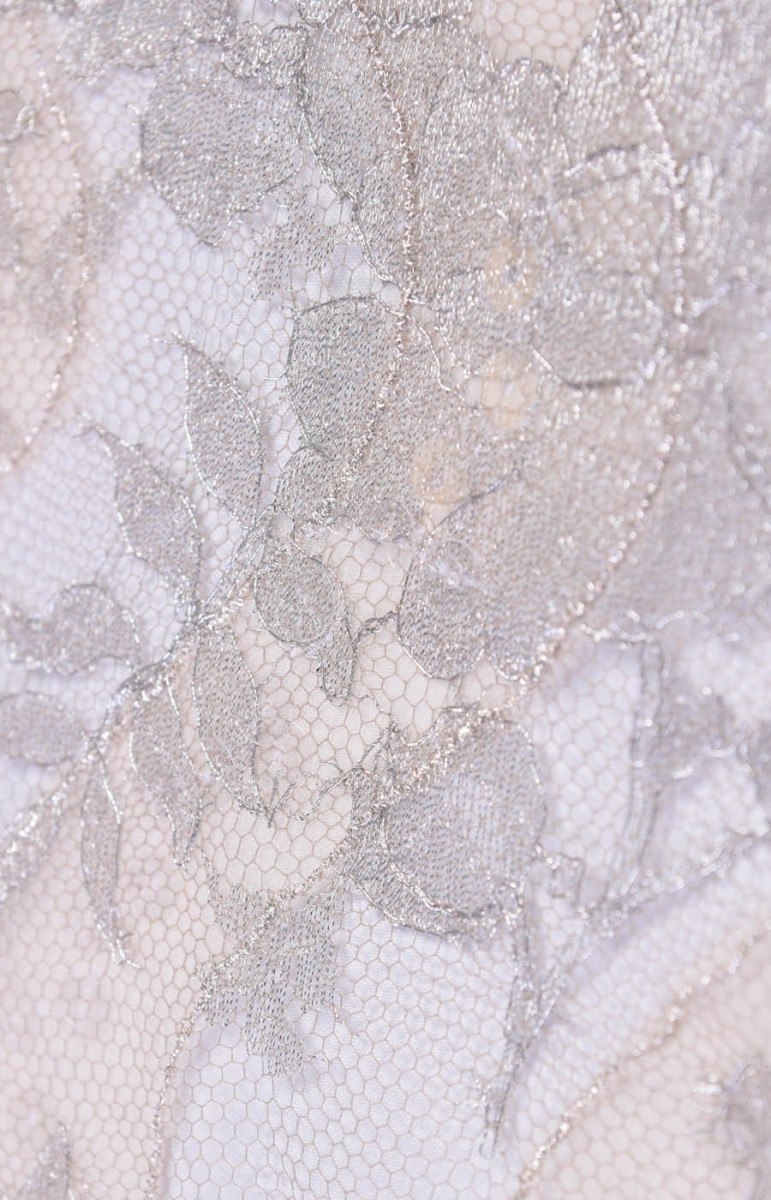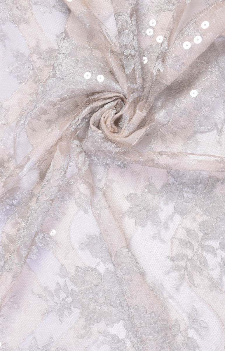 Fenomenālas mežģīnes pelēkā smilškrāsā ar viļņu un ziedu motīvu no spīdīga pavediena. Katrs otrais vilnis ir izklāts ar zīda šifonu un dekorēts ar caurspīdīgiem fliteriem. Mežģīņu platums ir 80 cm. Tas ir caurspīdīgs, viegls, neelastīgs un skaisti spīd. Ideāli piemērots kleitām vai blūzēm.