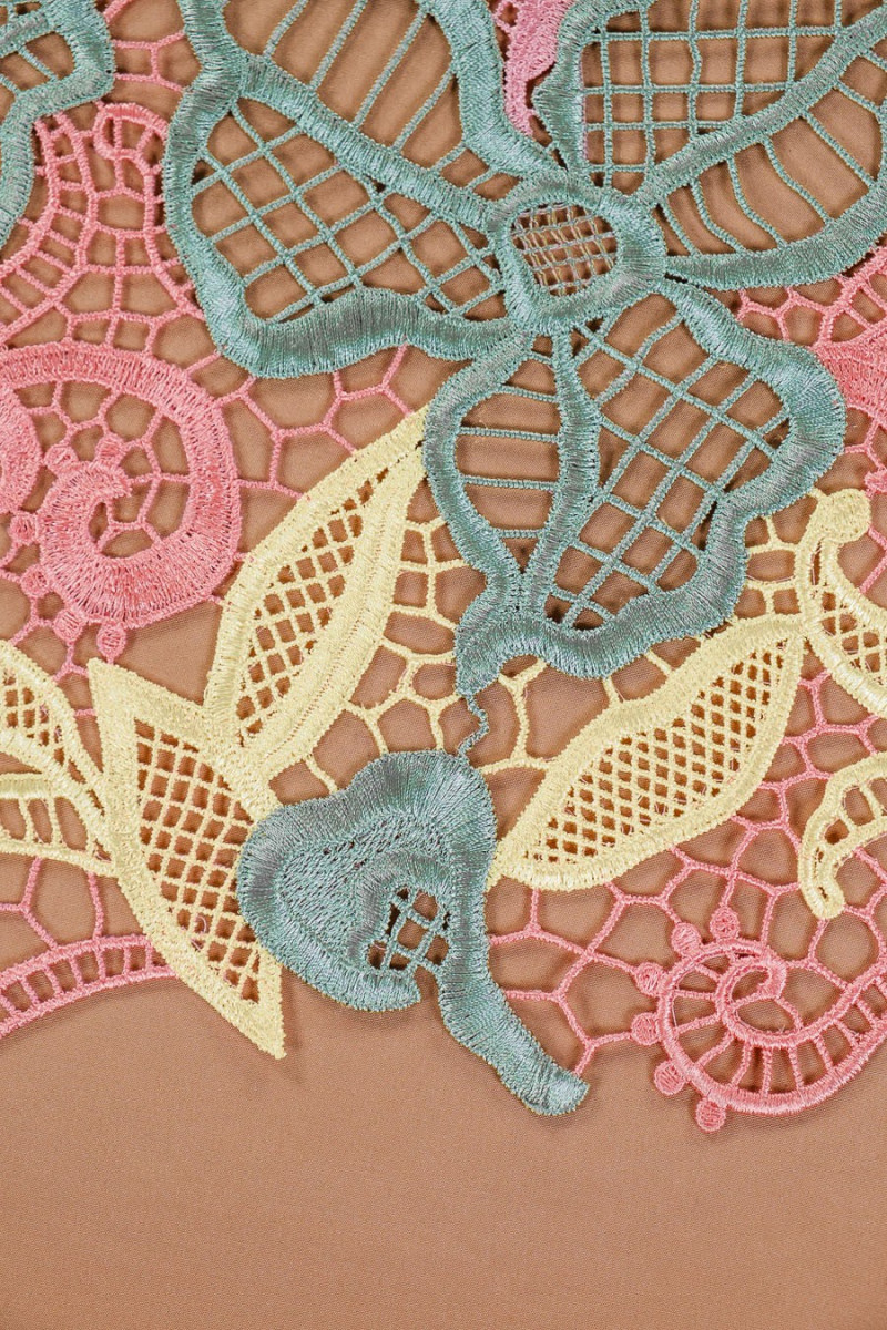 Itāļu guipure mežģīnes pasteļtoņos, vidēja biezuma. Mēs iesakām to kleitām vai svārkiem.