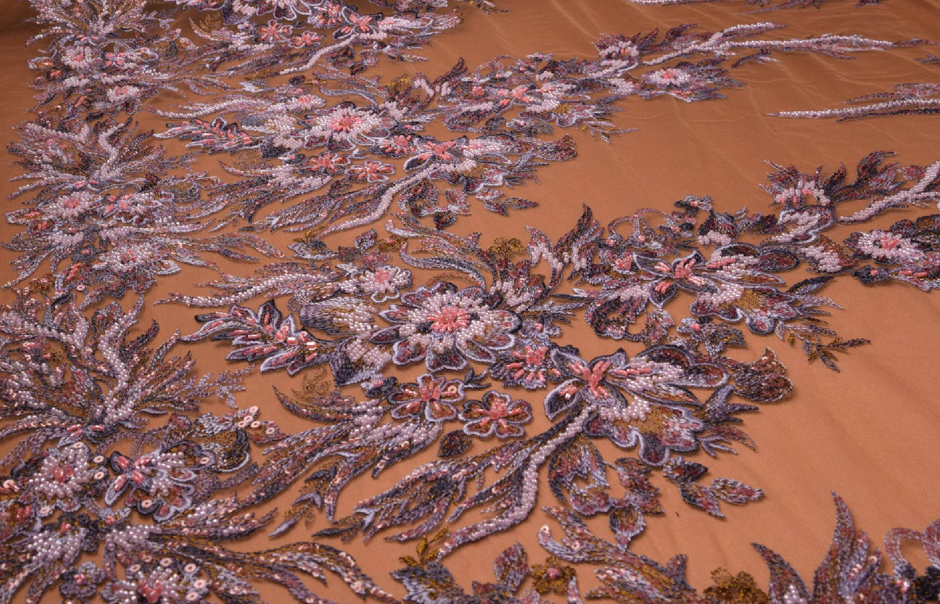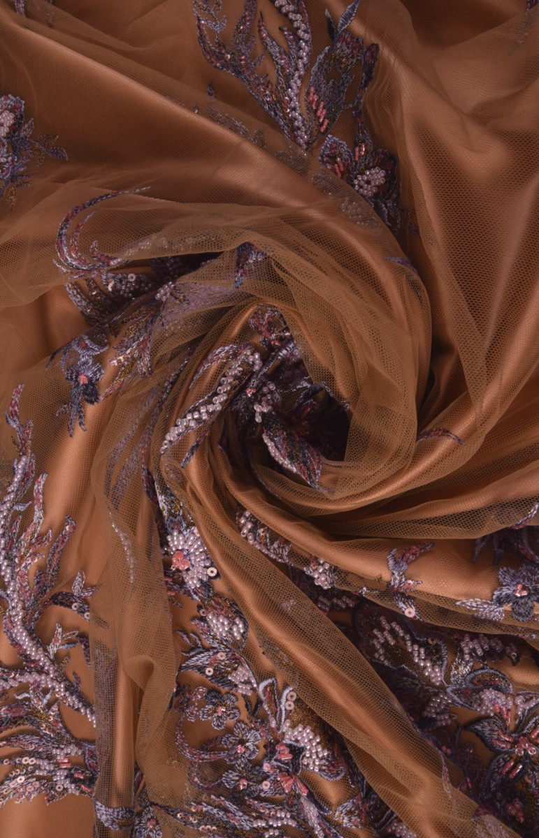 Mežģīnes, kas izšūtas ar pērlēm un fliteriem ar augošu rakstu. Iespēja griezt aplikācijas (izmērs apmēram 30 cm) un šūt uz citiem audumiem. Modelis apakšā ir apmēram 60 cm augsts. Krāsas: ceriņi /violeta/rozā raksts uz kaila tilla. Mēs iesakām to saskaņot ar zīda satīnu