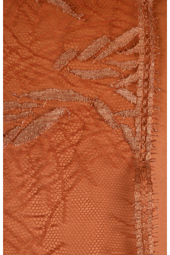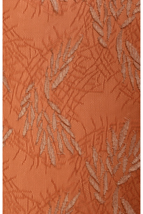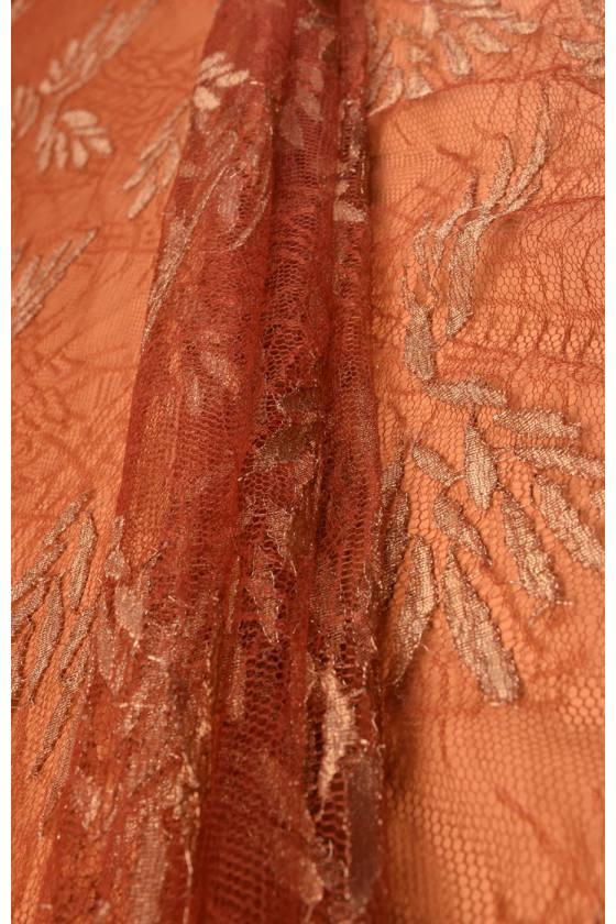Skaistas franču mežģīnes sarkanīgi zelta krāsā ar lurex diegu. To var izmantot, lai šūtu blūzi, kleitu vai ieliktņus. Mēs tam iesakām zīda satīna oderi.