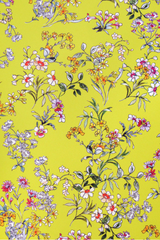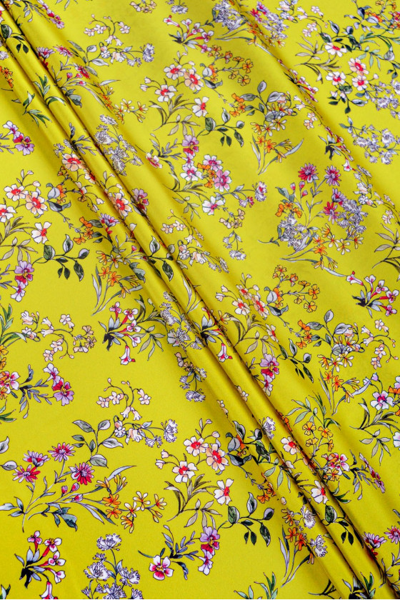 Itāļu poliestera satīns ar maziem, spilgtiem ziediem uz dzeltena fona. Poliestera satīns ir samtains audums ar smalku spīdumu.