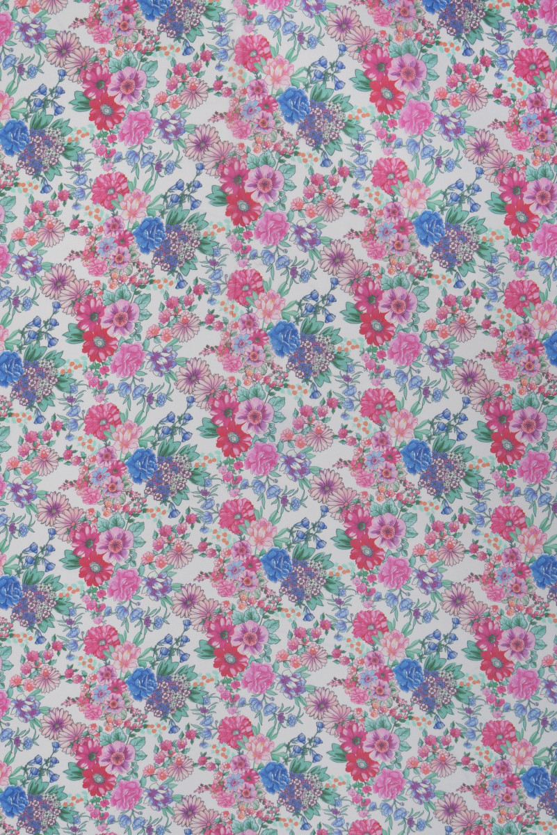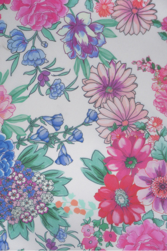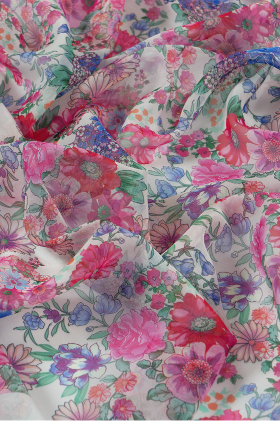 Itāļu krēmkrāsas poliestera šifons ar krāsainu ziedu motīvu. Šifons ir ļoti delikāts, gaisīgs un caurspīdīgs audums. Ideāli piemērots gaisīgām kleitām un blūzēm. Neelastīgs audums.