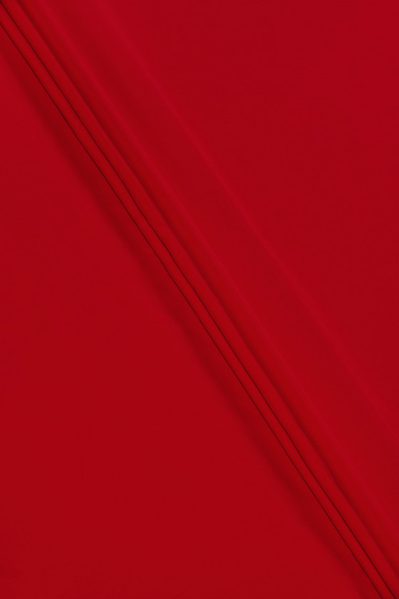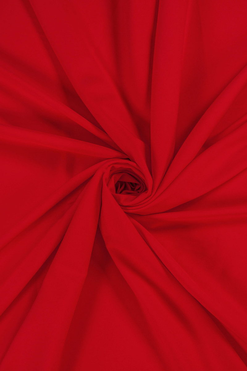 Itāļu kadi tipa poliestera audums sarkanā krāsā. Audums ir necaurspīdīgs, plūstošs, matēts un neelastīgs. Tas ir vidēja biezuma. Ideāli piemērots kleitām, svārkiem un blūzēm.