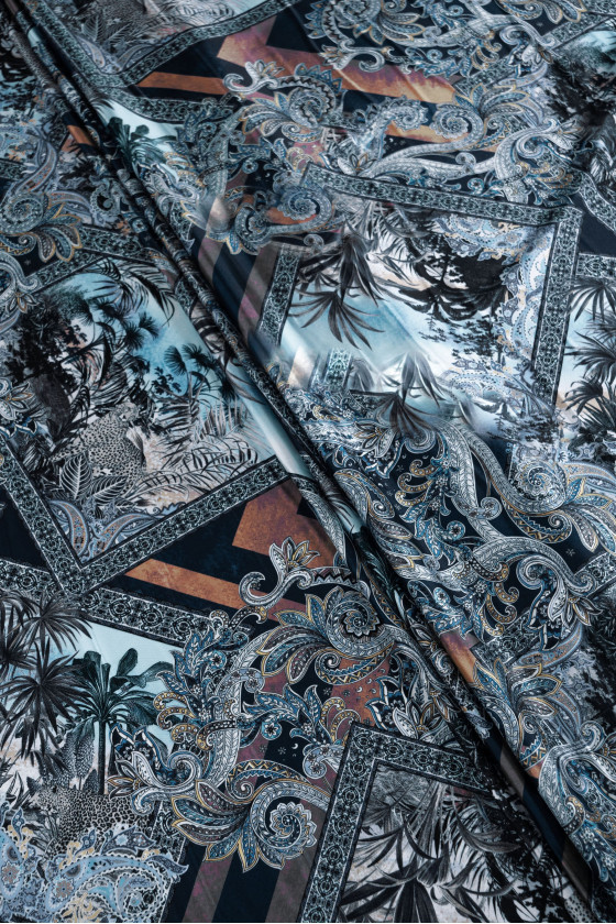 Itāļu poliestera sarža audums ar austrumu motīviem tumši zilā un brūnā krāsā. Twill ir audums ar pinuma austu, mīkstu, ļoti izturīgu, maigi stīvu, lai tas derētu. Lieliski piemērots krekla, kleitas, svārku vai šalles/šalles šūšanai.