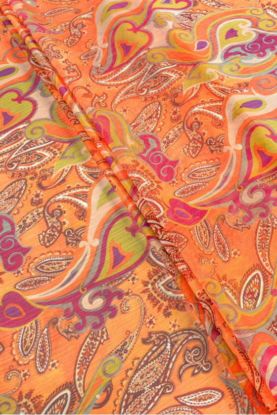 Itāļu poliestera šifons (krokots) ar austrumu motīvu sarkanā un oranžā krāsā. Krokots šifons ir ļoti delikāts, gaisīgs, caurspīdīgs audums ar nedaudz "krokotu" struktūru.