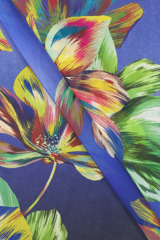 Itāļu poliestera šifons ar lielu, krāsainu ziedu motīvu uz tumši zila tonija fona. Audums ir plāns, caurspīdīgs, viegls un gaisīgs, neelastīgs. Ideāli piemērots kleitas, blūzes, svārku vai šalles šūšanai.