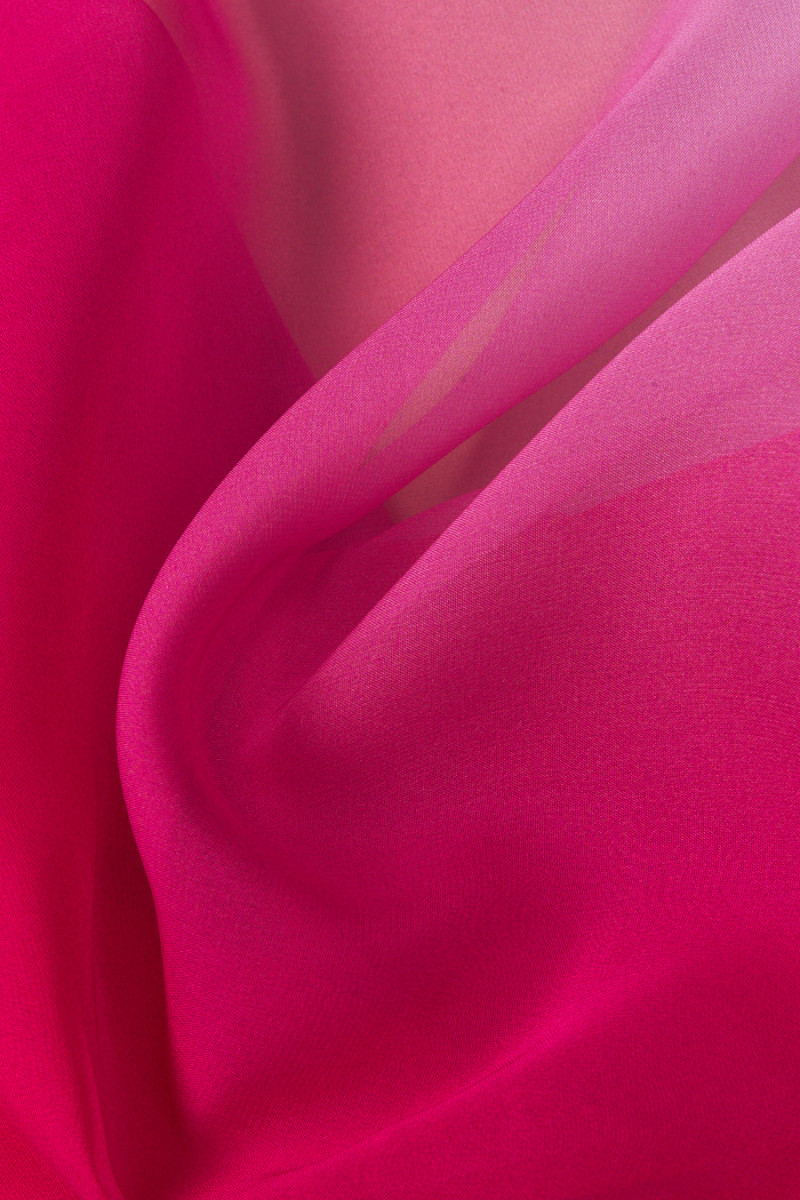 Itāļu poliestera šifons ar ombre motīvu četrās savstarpēji saistītās krāsās - violeta, virši, aveņu un gaiši rozā. Motīvs rodas pēc auduma platuma, un mēs to šujam apkārt. Šifons ir plāns, caurspīdīgs, gaisīgs un viegls audums - lieliski piemērots kleitas, blūzes, svārku vai šalles šūšanai.