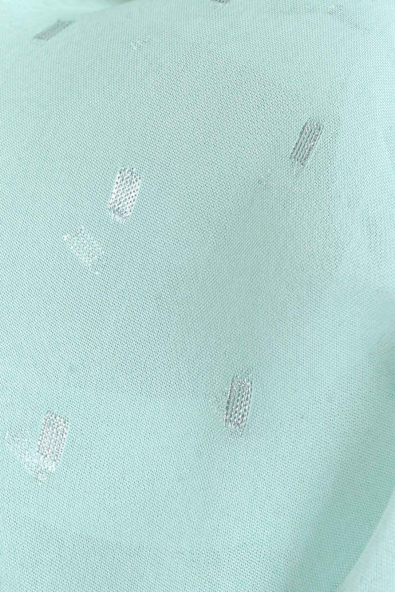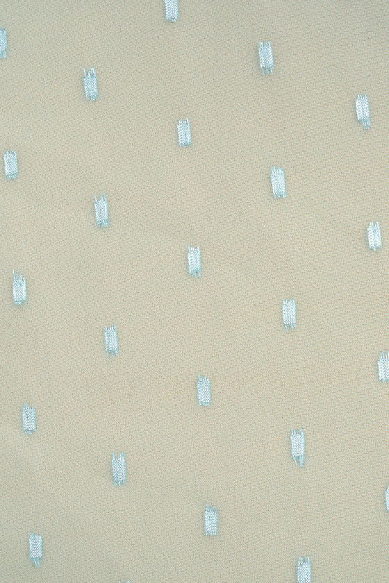 Itāļu piparmētru krāsas poliestera šifons ar mazu, ģeometrisku rakstu motīvu, kas izgatavots no sudraba lurex pavediena. Audums ir plāns un plūstošs, tāpēc tas ir lieliski piemērots gaisīgas kleitas, blūzes vai šalles šūšanai. Fantastisks piedāvājums pasteļtoņu, nedaudz spīdīgu audumu faniem.