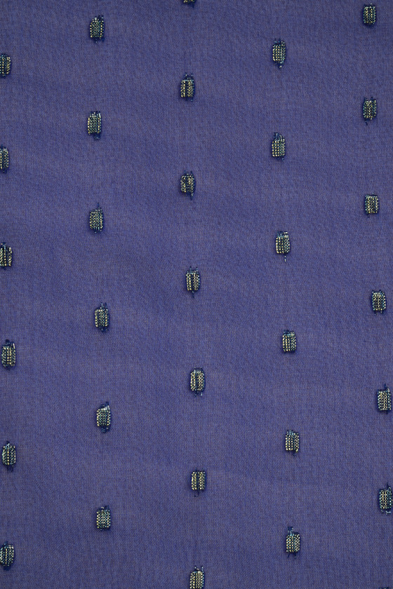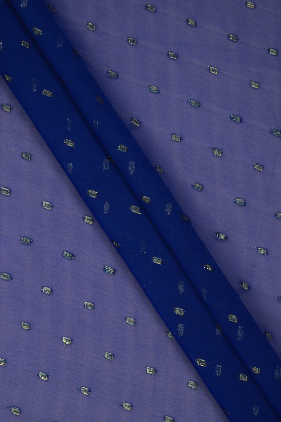 Itāļu rudzupuķu zilais poliestera šifons ar mazu, ģeometrisku rakstu motīvu, kas izgatavots no zelta lurex pavediena. Audums ir plāns un plūstošs, tāpēc tas ir lieliski piemērots gaisīgas kleitas, blūzes vai šalles šūšanai. Fantastisks piedāvājums tumšāku, nedaudz spīdīgu audumu faniem.