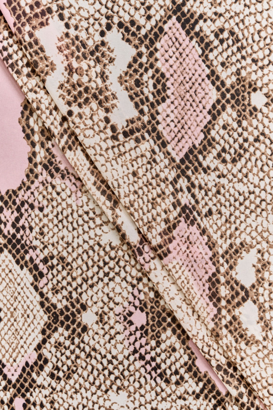 Itāļu poliestera georgette ar lielu čūskādas motīvu bēšā, brūnā un melnā krāsā uz rozā fona. Audums ar graudainu virsmu, gaisīgs, nedaudz caurspīdīgs, drapērijas skaistā, plūstošā veidā, neelastīgs. Ideāls piedāvājums dzīvnieku modeļu faniem mūžīgās krāsās. Tas ir lieliski piemērots gaisīgas kleitas, svārku, blūzes un krekla šūšanai.