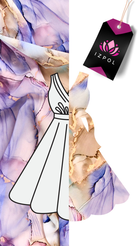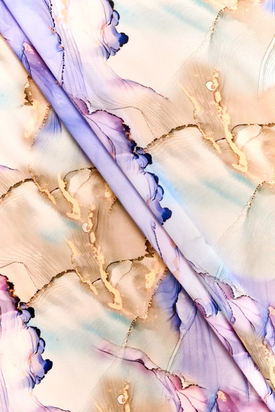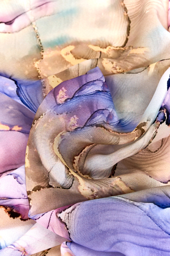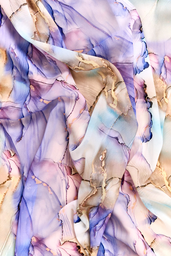 Itāļu poliestera šifons ar interesantu lielu uztriepju motīvu purpursarkanā krāsā ar zelta vēnām. Rakstu apgaismo gaiši, ēnaini akcenti piparmētru un smilškrāsas toņos. Audums ir gaisīgs, viegls, caurspīdīgs, ļoti maigs un patīkams pieskarties. Fantastisks piedāvājums cilvēkiem, kuriem patīk spēcīgas, spilgtas krāsas un oriģināls dizains. Audums ir lieliski piemērots gaisīgas kleitas, svārku, blūzes un šalles šūšanai.