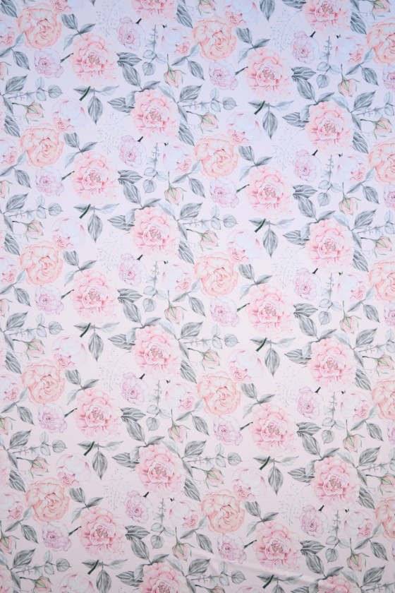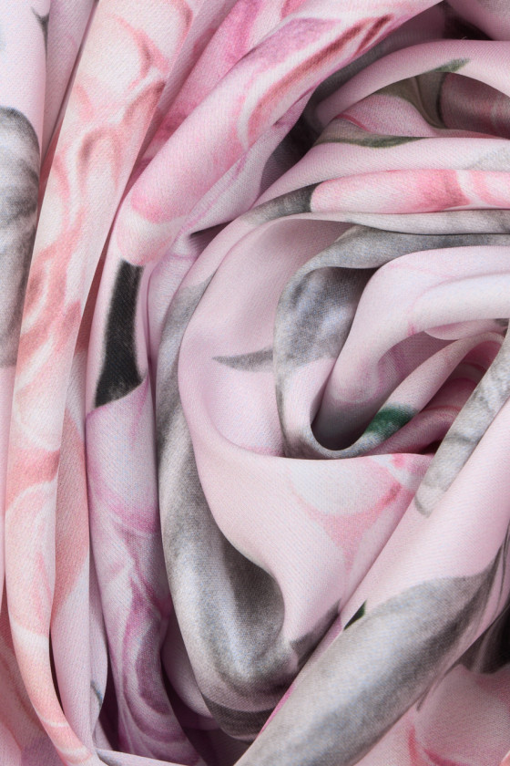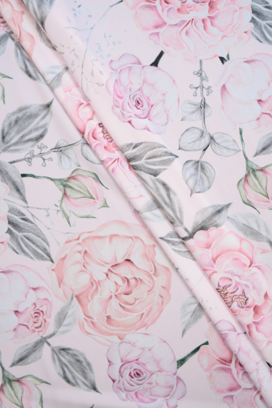 Itāļu poliestera satīns ar lielu peoniju motīvu uz gaiši rozā fona. Raksts ir izgatavots no smalkiem, pasteļtoņiem. Audums ir gaisīgs, viegls, ar gludu satīna austu, maigu un patīkamu pieskārienu. Romantisks piedāvājums cilvēkiem, kuriem patīk ziedu raksti. Audums ir lieliski piemērots gaisīgas kleitas, svārku, blūzes un krekla šūšanai.