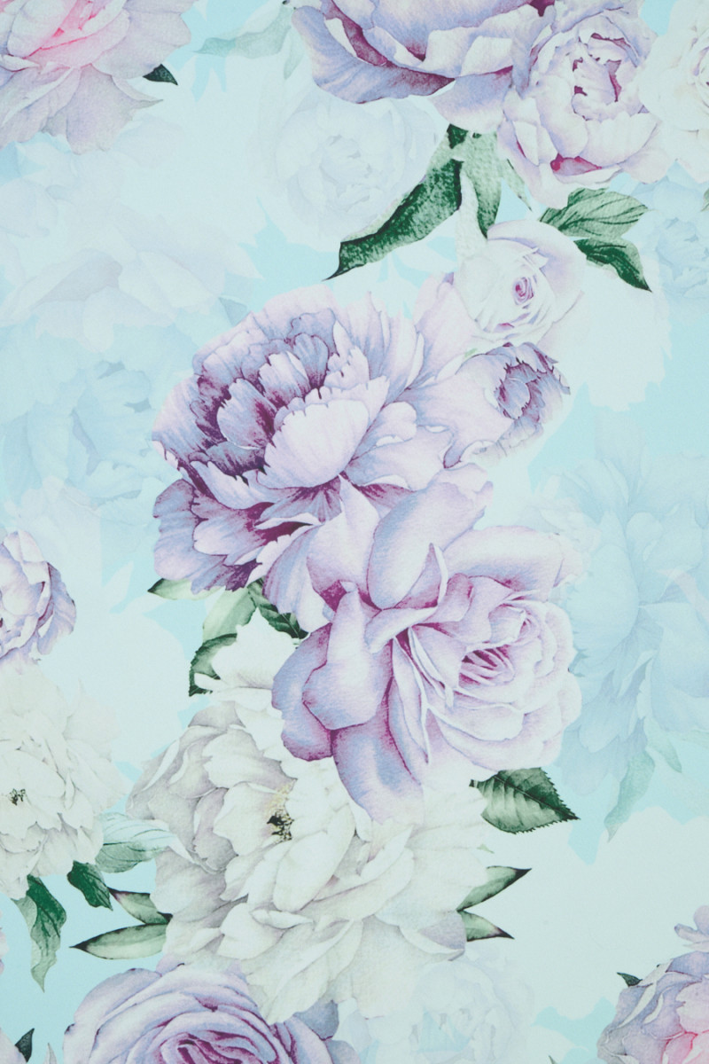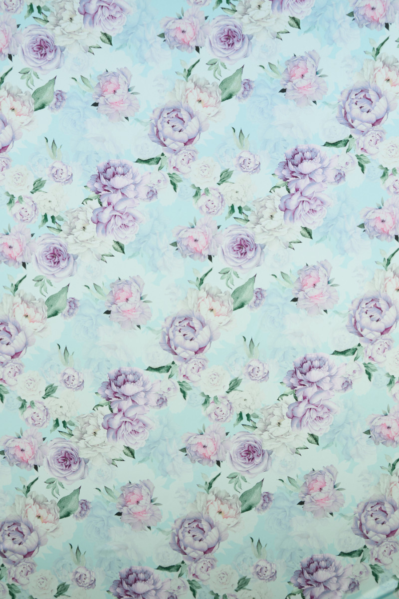 Itāļu poliestera satīns ar lielu peoniju motīvu uz gaiša tirkīza fona. Raksts ir izgatavots no smalkiem, pasteļtoņiem. Audums ir gaisīgs, viegls, ar gludu satīna austu, maigu un patīkamu pieskārienu. Romantisks piedāvājums cilvēkiem, kuriem patīk ziedu raksti. Audums ir lieliski piemērots gaisīgas kleitas, svārku, blūzes un krekla šūšanai.