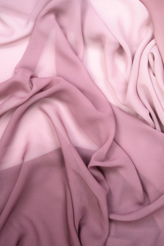 Ombre poliestera šifons rozā toņos. Raksts iet no tumši rozā vienā auduma malā, caur gaišiem toņiem, līdz vēl vairāk tumši rozā otrā malā - mēs iesakām šūt apkārtmēr. Audums ir ļoti vējains, viegls, plūstošs, nedaudz caurspīdīgs un neelastīgs. Lielisks piedāvājums rudens krāsās, kas labi noderēs kleitas, svārku, kā arī tunikas vai krekla šūšanā.