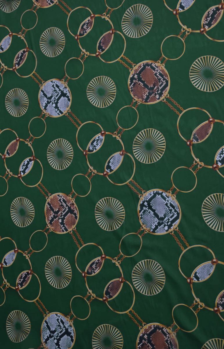 Poliestera šifons ar iedomātu rotaslietu rakstu (apļi ar diametru 12-15 cm) ir ļoti delikāts, gaisīgs, caurspīdīgs audums. Ideāli piemērots gaisīgām kleitām, svārkiem, blūzēm vai pareos. Neelastīgs audums. Krāsas: uz pudeles zaļa fona