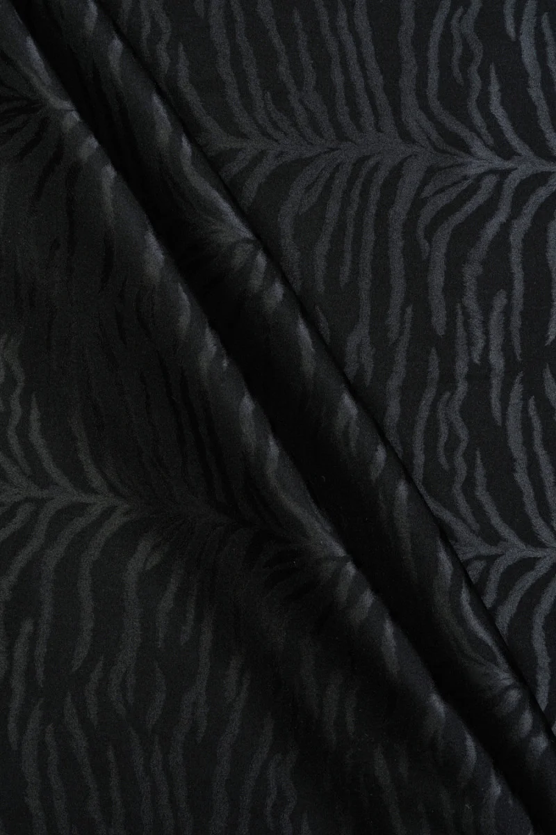 Itāļu žakarda audums, zīds ar tīģera motīvu melnā krāsā. Regulāri uzklāts matēts raksts, kas izgatavots uz satīna, ar nedaudz pamanāmu izciļņu. Audums ir plūstošs, necaurspīdīgs, elastīgs un pabeigts ar elegantu spīdumu. Skaists audums, kas lieliski piemērots blūzēm, krekliem, kā arī gaisīgiem svārkiem vai brīvākām biksēm.