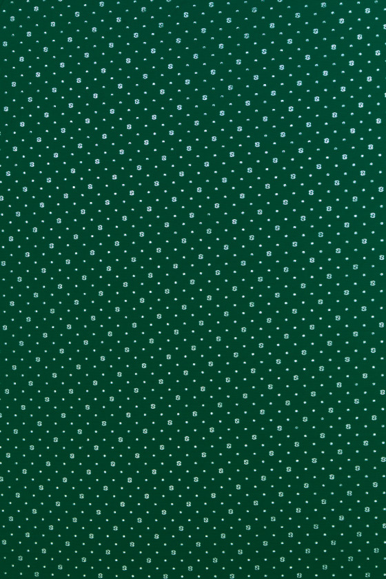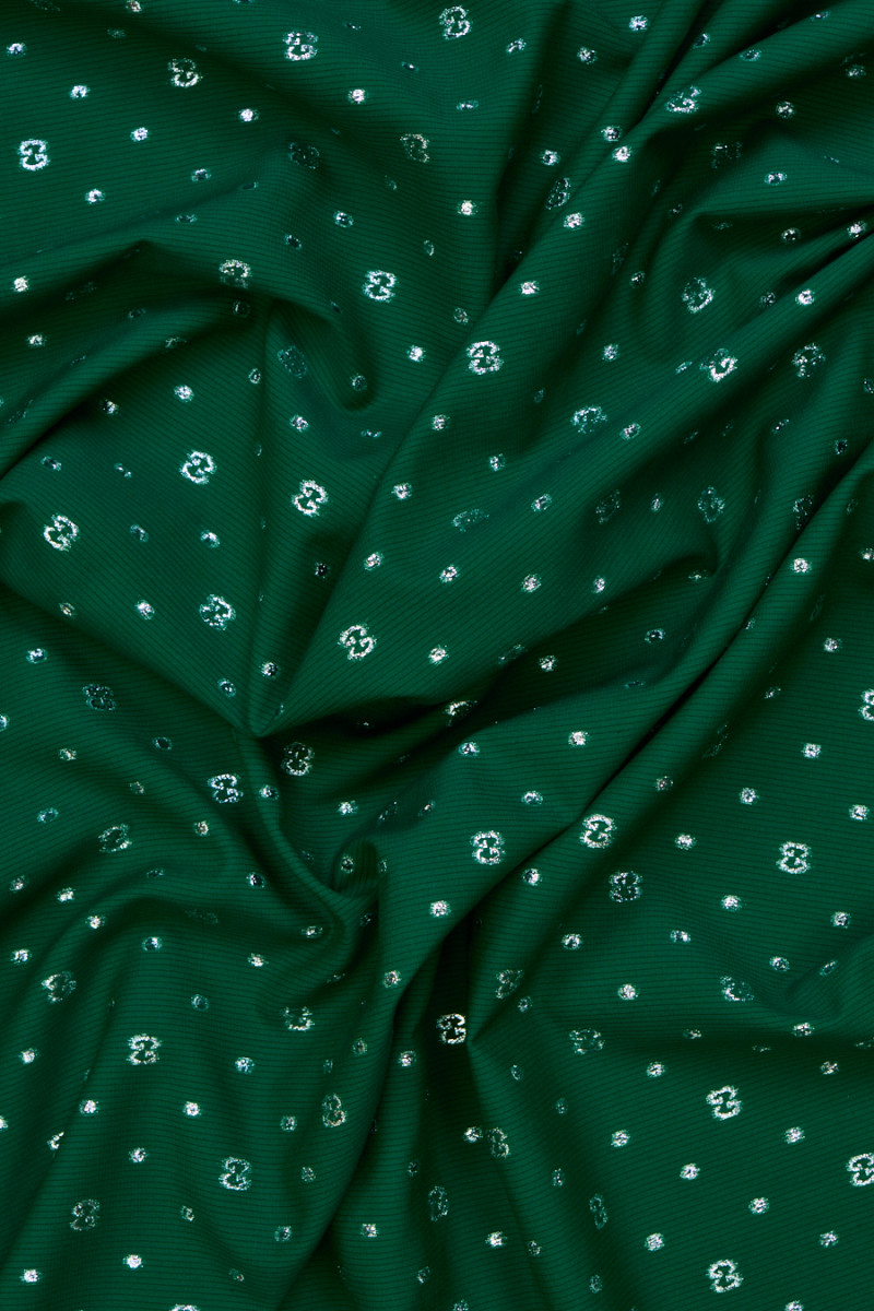 Krekla audums zaļā krāsā ar mazu, blīvi novietotu svītru motīvu. Viss ir regulāri dekorēts ar punktiem un burtiem, kas izgatavoti no sudraba, spīdīga pavediena. Audums ir plāns, bet necaurspīdīgs, mīksts, neelastīgs un nāk no pazīstama modes dizainera kolekcijas, pateicoties raksta izkārtojumam, mēs iesakām apļveida šūšanu. Ideāls piedāvājums krekliem, blūzēm un vieglām kleitām.