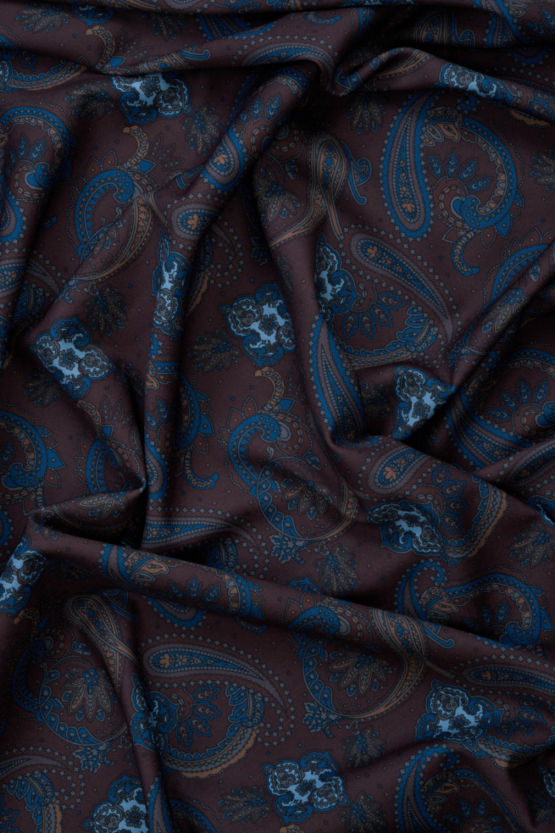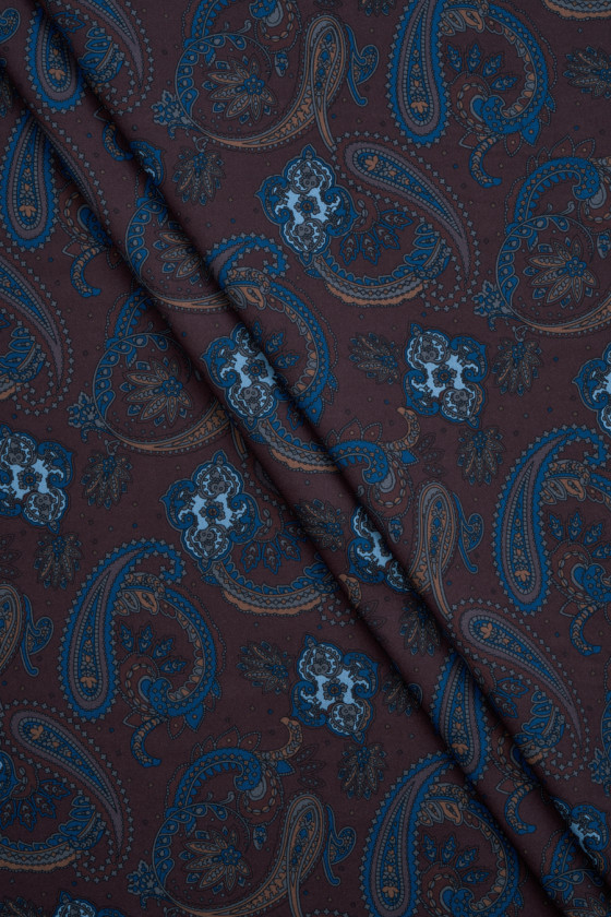 Oriģināls divpusējs trikotāžas audums - no vienas puses pasley raksts brūnā un tumši zilā krāsā, no otras puses - tumši zils un pelēks čeks.