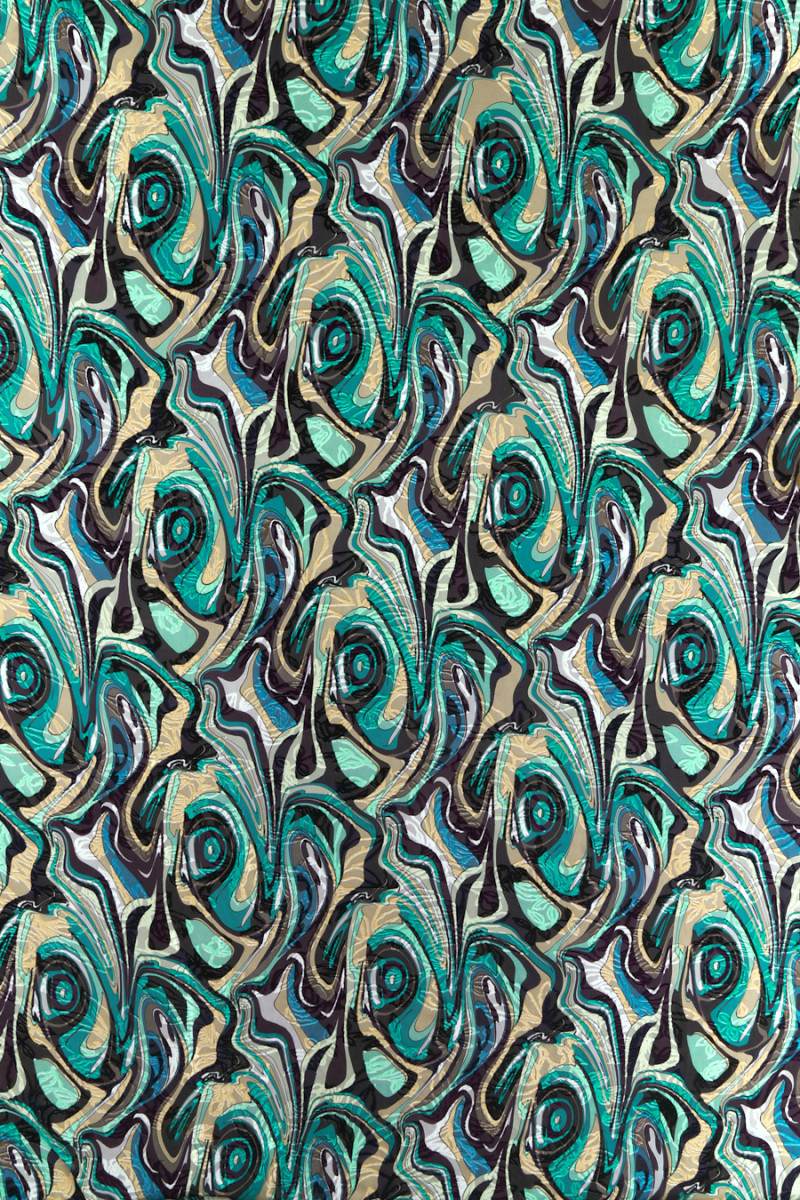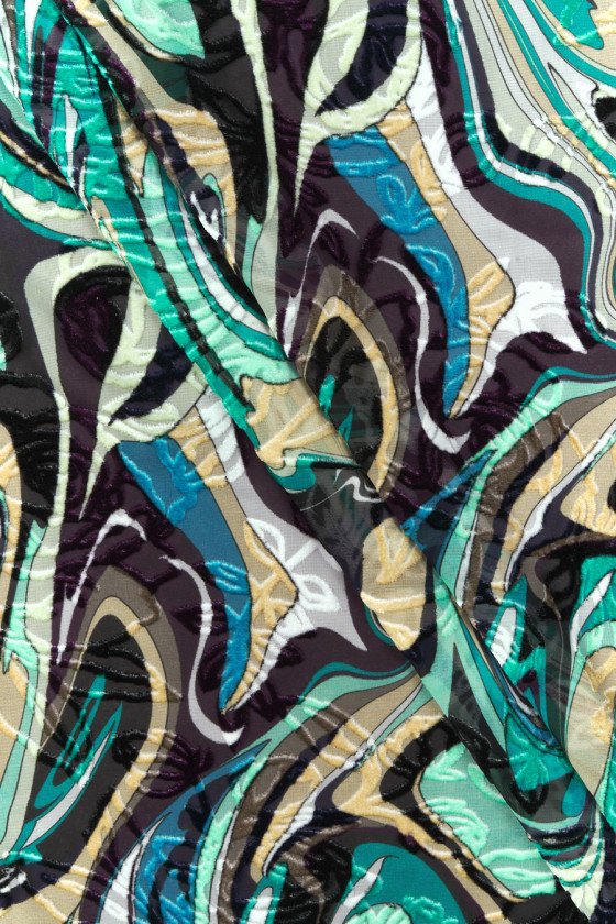 Itāļu zīda viskozes velūra devore tips ar izdomātiem rakstiem melnā, bēšā un tirkīza krāsā. Devory audums ir gluda, caurspīdīga zīda šifona kombinācija ar necaurspīdīgiem, velūra viskozes rakstiem.