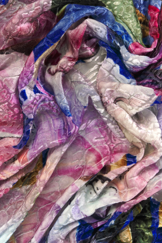 Itāļu viskozes-zīda velūrs ar devore tipa lieliem, purpura rozā ziediem uz rudzupuķu zila fona - modelis ir apkārtmērs. Devory audums ir gluda, caurspīdīga zīda šifona kombinācija ar necaurspīdīgiem, velūra viskozes rakstiem. Plāns, caurspīdīgs, mīksts un neelastīgs audums - ideāli piemērots kleitas, blūzes vai svārku šūšanai.