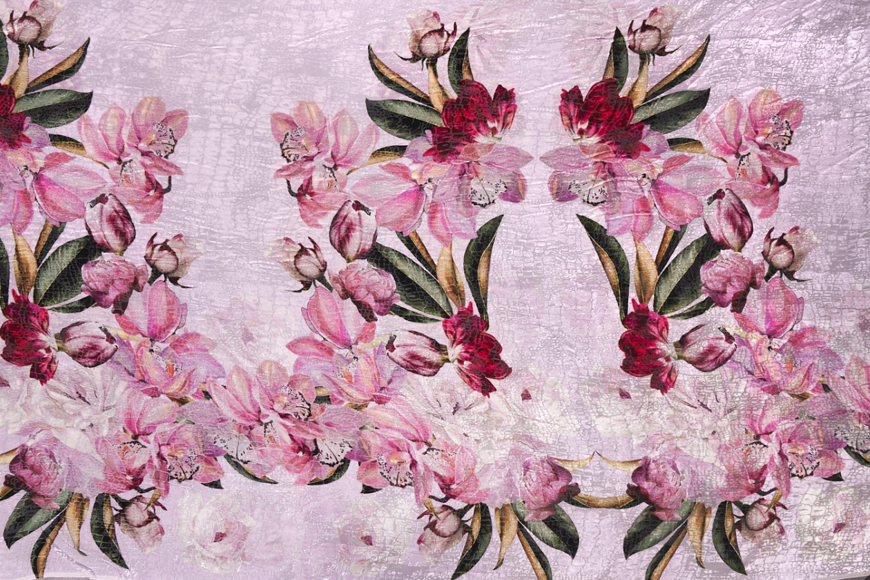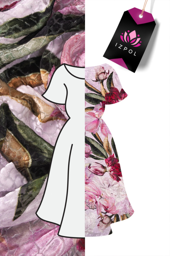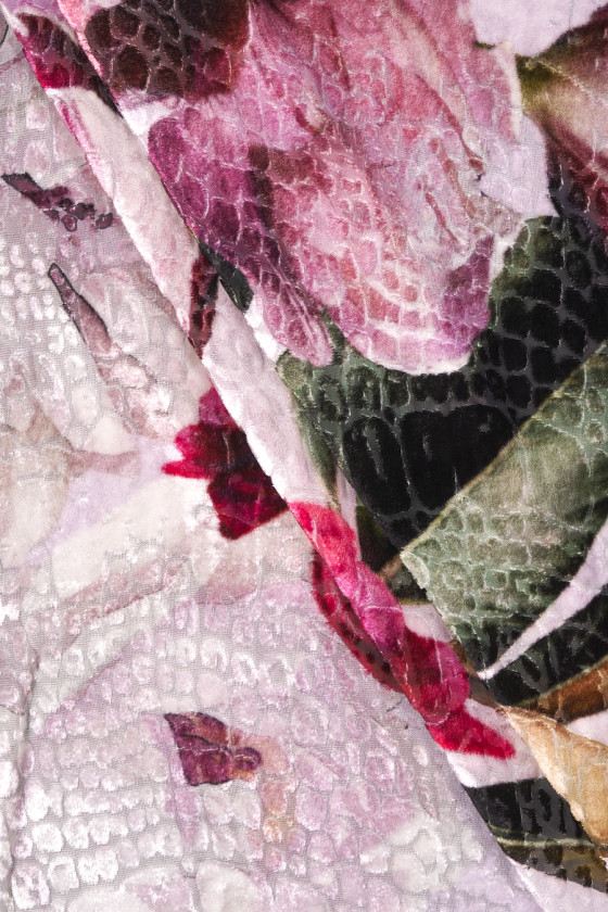 Itāļu viskozes-zīda velūrs devore ar lieliem, rozā un sarkaniem ziediem uz gaiši rozā fona - modelis ir apkārtmērs. Devory audums ir gluda, caurspīdīga zīda šifona kombinācija ar necaurspīdīgiem, velūra viskozes rakstiem. Plāns, caurspīdīgs, mīksts un neelastīgs audums - ideāli piemērots kleitas, blūzes vai svārku šūšanai.