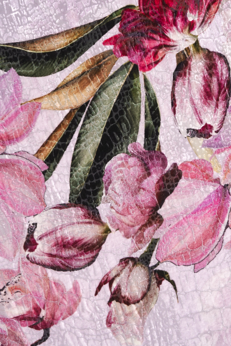 Itāļu viskozes-zīda velūrs devore ar lieliem, rozā un sarkaniem ziediem uz gaiši rozā fona - modelis ir apkārtmērs. Devory audums ir gluda, caurspīdīga zīda šifona kombinācija ar necaurspīdīgiem, velūra viskozes rakstiem.