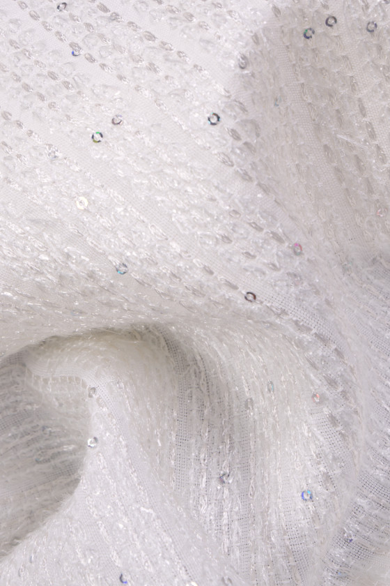 Itāļu Chanel kostīmu audums krēmkrāsā. Gluds audums ar horizontālu šuvi 1 cm platumā, dekorēts ar maziem fliteriem. Vidēji biezs, neelastīgs, mīksts audums. Ideāli piemērots kleitas, svārku šūšanai vai dekoratīviem nolūkiem.