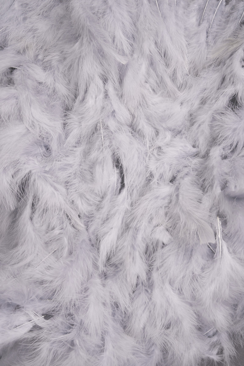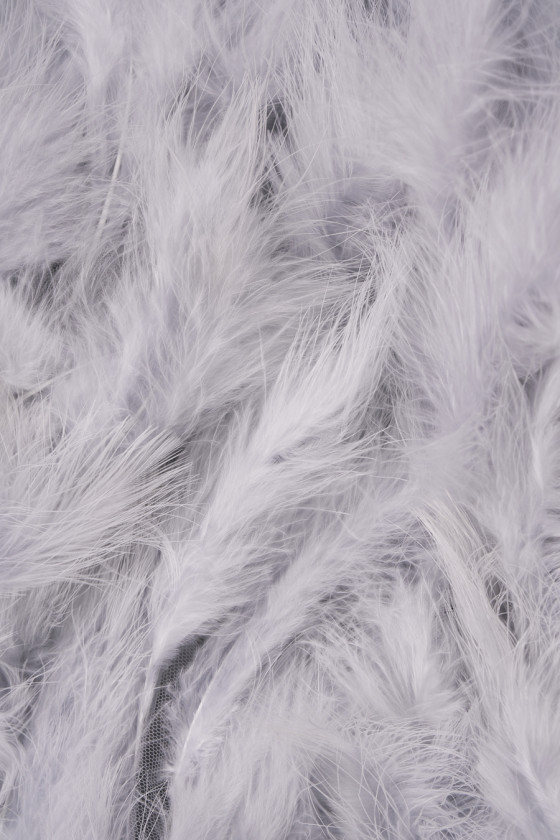 Fenomenāls vakara audums pelēkā krāsā - siets ir blīvi apgriezts ar apmēram 15 cm garām gaiļa spalvām - mēs to šujam apkārt. Audums ir nedaudz caurspīdīgs, 115 cm plats, spalvas ir mīkstas un pūkainas.