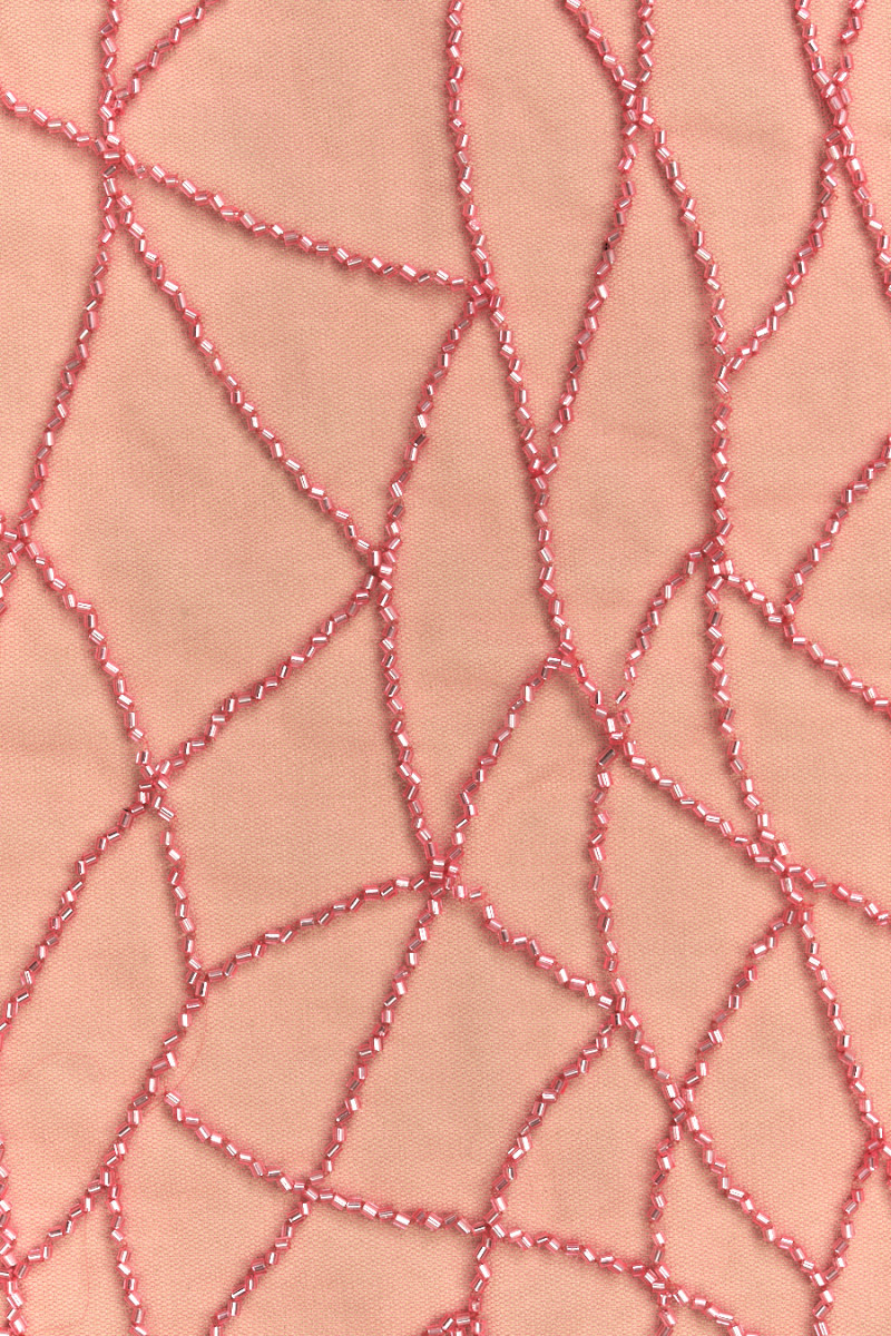 Itāļu stīvais tills ar klasiskajām koraļļu cilpām. Tas ir smalki dekorēts ar tādas pašas krāsas cilindriskām pērlītēm. Tie veido dimantam līdzīgu ģeometrisku rakstu, kas sabiezē pret vienu auduma malu (nav dekoratīvas apdares). Audums ir ļoti efektīvs, caurspīdīgs (nepieciešama odere), smags, nedaudz elastīgs - mēs to šujam apkārtmēr. Fantastisks piedāvājums vakarkleitas, svārku vai blūzes šūšanai ļoti interesantā izdevumā.