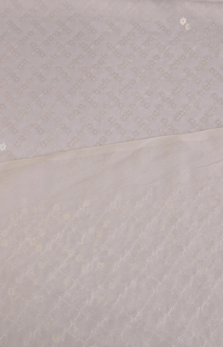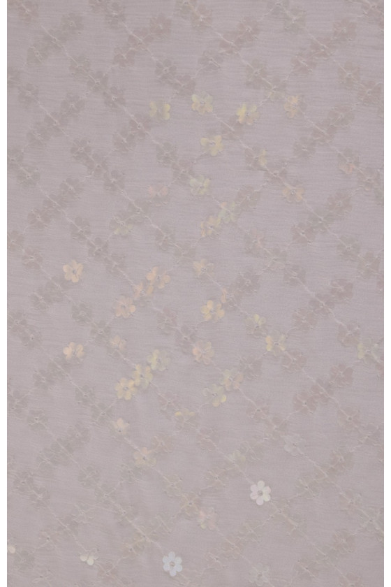 Zīda šifons nedaudz krokots ecru krāsā, izšūts ar maziem fliteriem - ziediem, kas veido šaha galdiņu. Audums ir ļoti efektīvs, caurspīdīgs - mēs iesakām izvēlēties oderi. To var šūt gan formāliem, gan kāzu tērpiem - kleitām, blūzēm, šallēm.