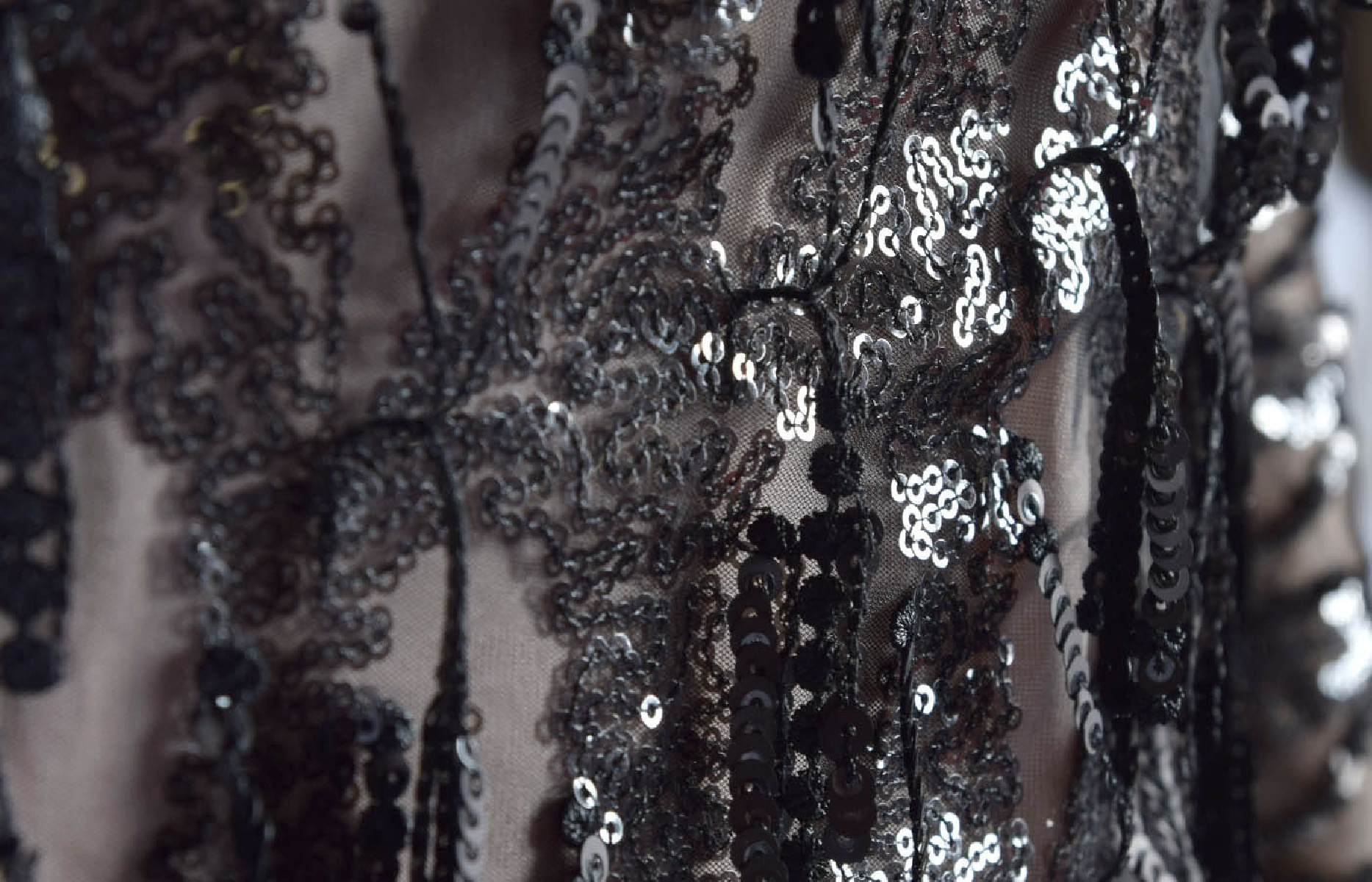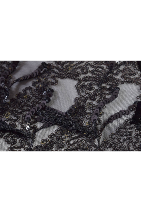 Fliteri, kas izšūti uz tilla. Turklāt tie ir dekorēti ar apmēram 4 cm gariem fliteru pušķiem. Lieliski piemērots dejām un Jaungada kleitām.