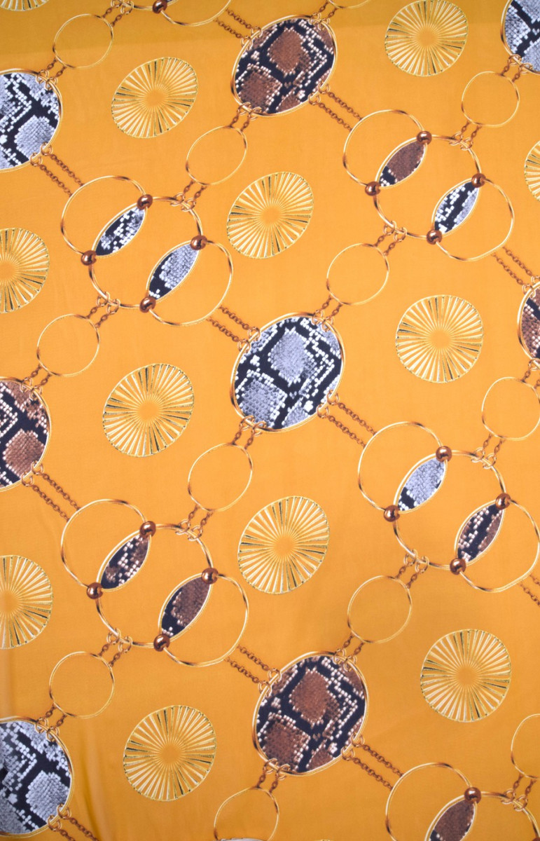 Poliestera šifons ar iedomātu rotaslietu rakstu (apļi ar diametru 12-15 cm) ir ļoti delikāts, gaisīgs, caurspīdīgs audums. Ideāli piemērots gaisīgām kleitām, svārkiem, blūzēm vai pareos. Neelastīgs audums. Krāsas: uz dzeltenā medus fona raksta