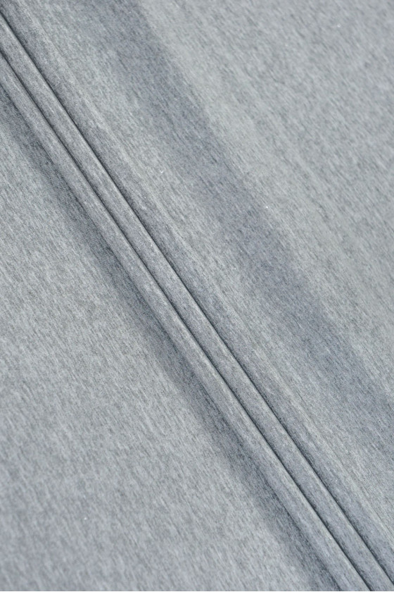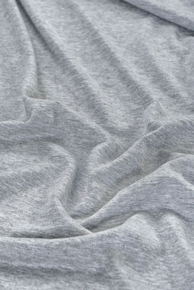 Itāļu viskozes trikotāžas audums pelēkā krāsā (melange) ar sudraba lurex diegu - ļoti laba kvalitāte. Plāns, elastīgs ar nelielu spīdumu. Lieliski piemērots blūzes vai t-krekla šūšanai.