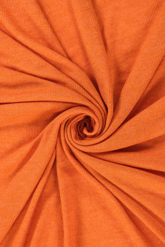 Itāļu kokvilnas trikotāžas audums oranžā krāsā ar platumu 120 cm. Audums ar raksturīgu, rievotu austu, kas atgādina welt.