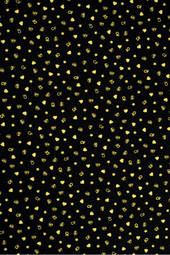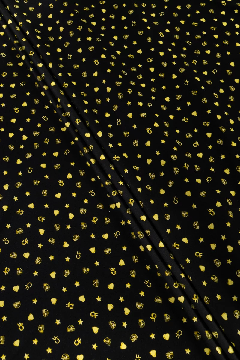 Itāļu sporta krekla audums melnā krāsā ar dzeltenu siržu un zvaigžņu motīvu - parakstīts ar pazīstama modes dizainera logotipu. Vidēji biezs trikotāžas audums, elastīgs - matēts.