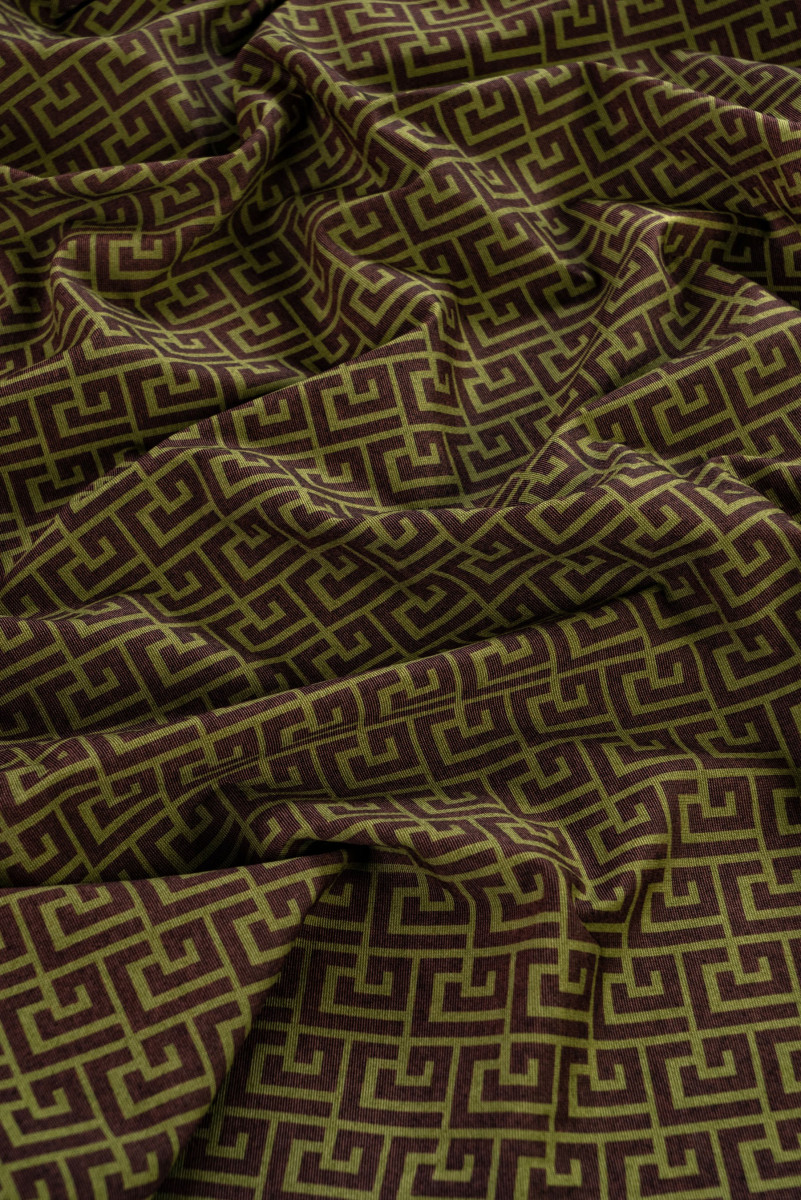 Itāļu viskozes krekls trikotāžas audums olīvu un brūnā krāsā - parakstīts ar pazīstamā franču modes nama logotipu. Džersija ir mīksts, necaurspīdīgs, maigi drapējošs trikotāžas audums, ko var šūt bez oderējuma. Tas ir lieliski piemērots ikdienas kleitām, svārkiem, jakām. Pirms šūšanas iesakām iepriekš sarauties.