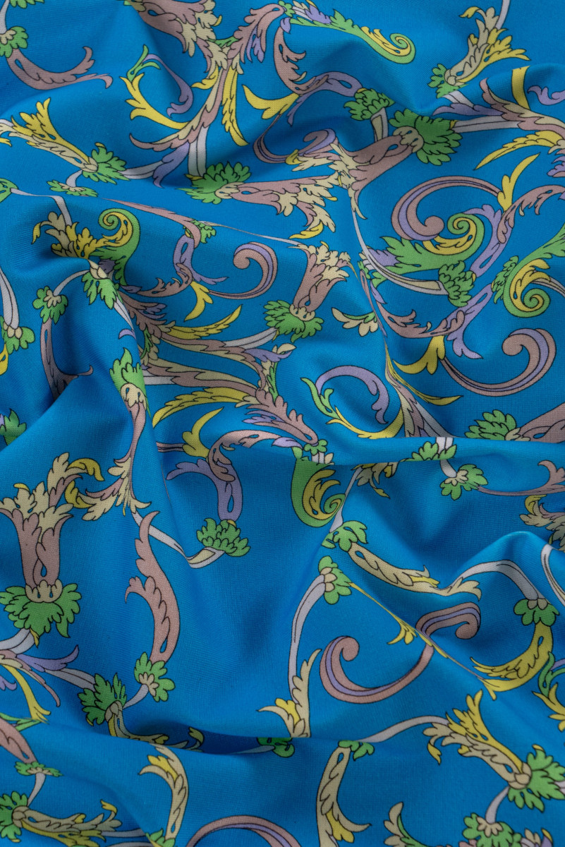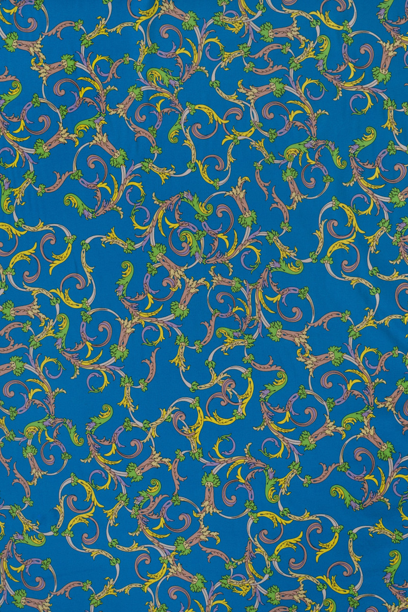 Itāļu viskozes krekla audums zilā krāsā ar zaļu un dzeltenu austrumu motīvu motīvu. Džersijas audums ir pārklājošs, maigi drapējošs trikotāžas audums, ko var šūt bez oderējuma.