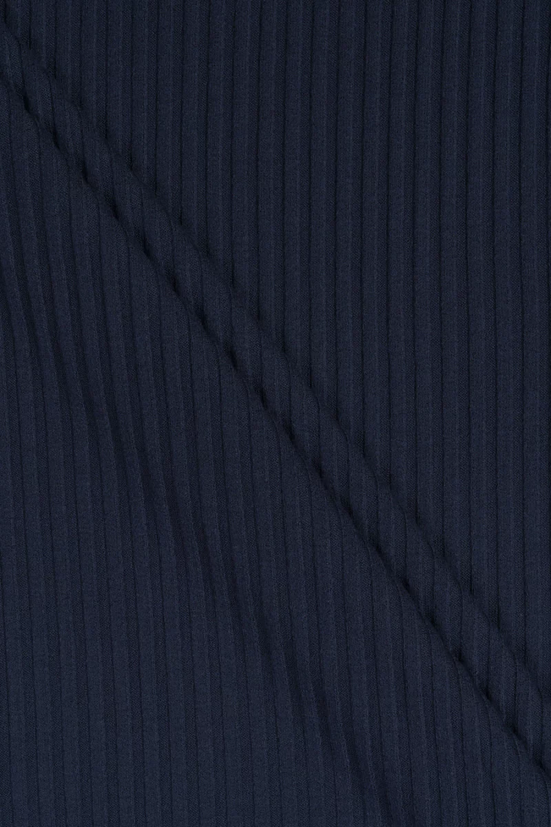 Itāļu trikotāžas audums ar plašu ribu austu (0,5 cm) tumši tumši zilā krāsā. Mīksts, ļoti elastīgs, necaurspīdīgs, patīkams pieskārienam trikotāžas audums - lieliski piemērots kleitas, svārku vai blūzes šūšanai.