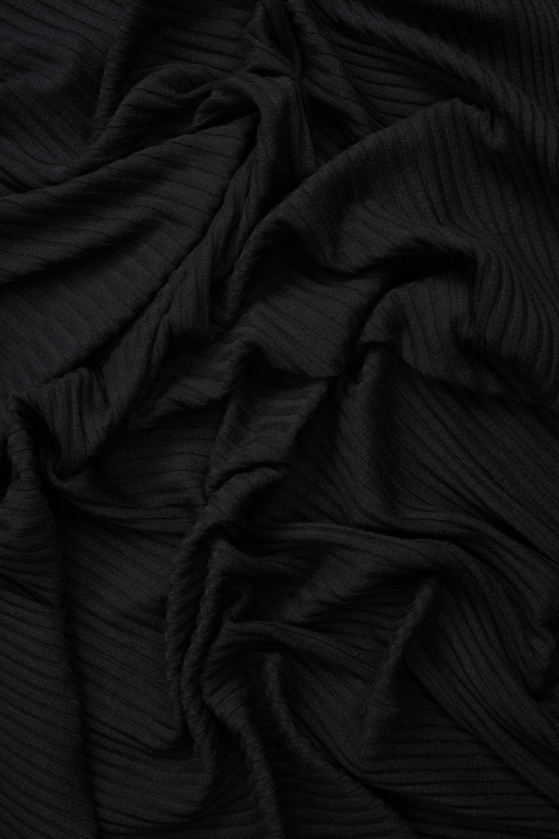 Itāļu trikotāžas audums ar plašu ribu austu (0,5 cm) melnā krāsā. Mīksts, ļoti elastīgs, necaurspīdīgs, patīkams pieskārienam trikotāžas audums - lieliski piemērots kleitas, svārku vai blūzes šūšanai.