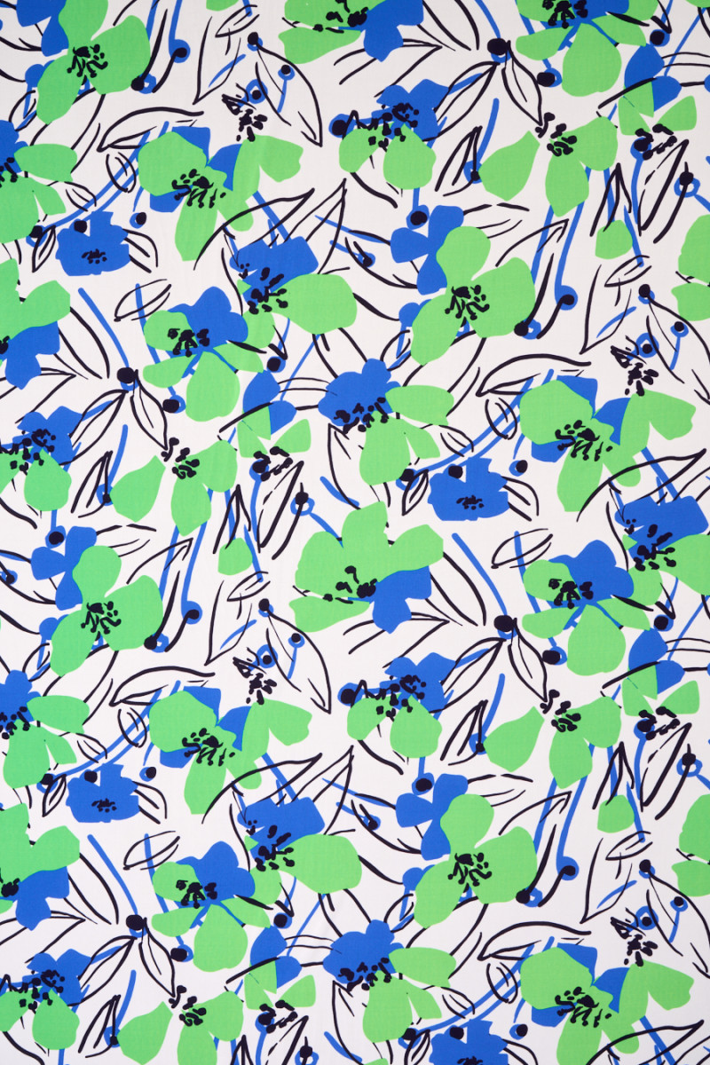 Itāļu viskozes trikotāžas audums uz krēmkrāsas, lieli ziedi enerģiskās zaļās un rudzupuķu krāsās un ar melnu lapu kontūrām. Trikotāžas audums ir elastīgs, atvēsinošs uz tausti, necaurspīdīgs un plūstošs. Viskozes trikotāžas audums ir dabīgs audums (iegūts no celulozes), ļoti mīksts un gaisīgs. Lielisks piedāvājums, lai izveidotu kleitu, svārkus vai blūzi.