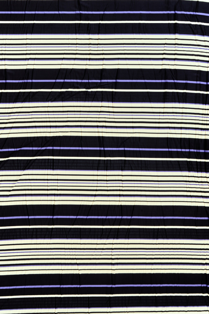 Itāļu 100% viskozes trikotāžas audums ar svītrām tumši zilā, violetā un krēmkrāsā. Blīvais modelis tiek atkārtots ik pēc 24 cm. Trikotāžas audums ir plūstošs, viegls, elastīgs, plāns, bet necaurspīdīgs. Tas ir lieliski piemērots blūzes, kleitas un svārku šūšanai.