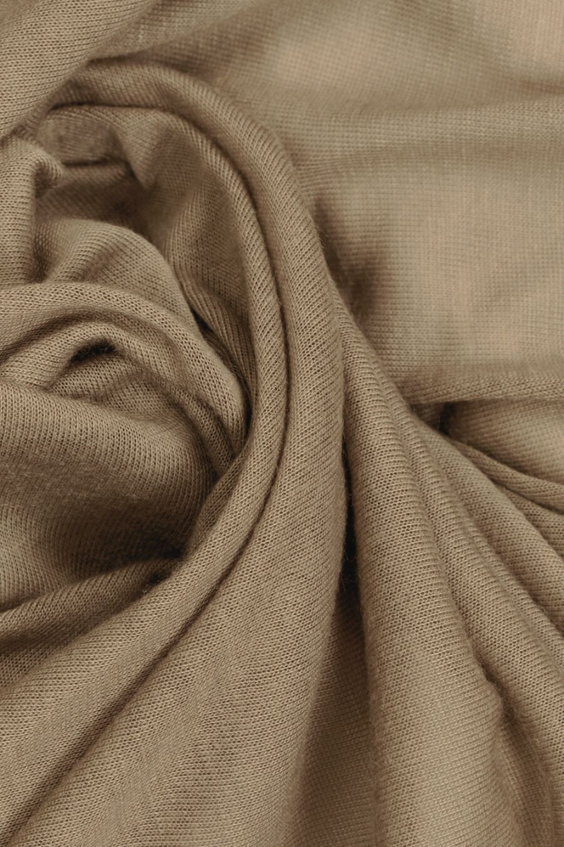 Itāļu poliestera trikotāžas audums tumši bēšā krāsā. Trikotāžas audums ir plāns, caurspīdīgs, mīksts, matēts un elastīgs. Mēs iesakām to blūzēm, topiem, T-krekliem, jūs varat to izmantot arī kā oderi.