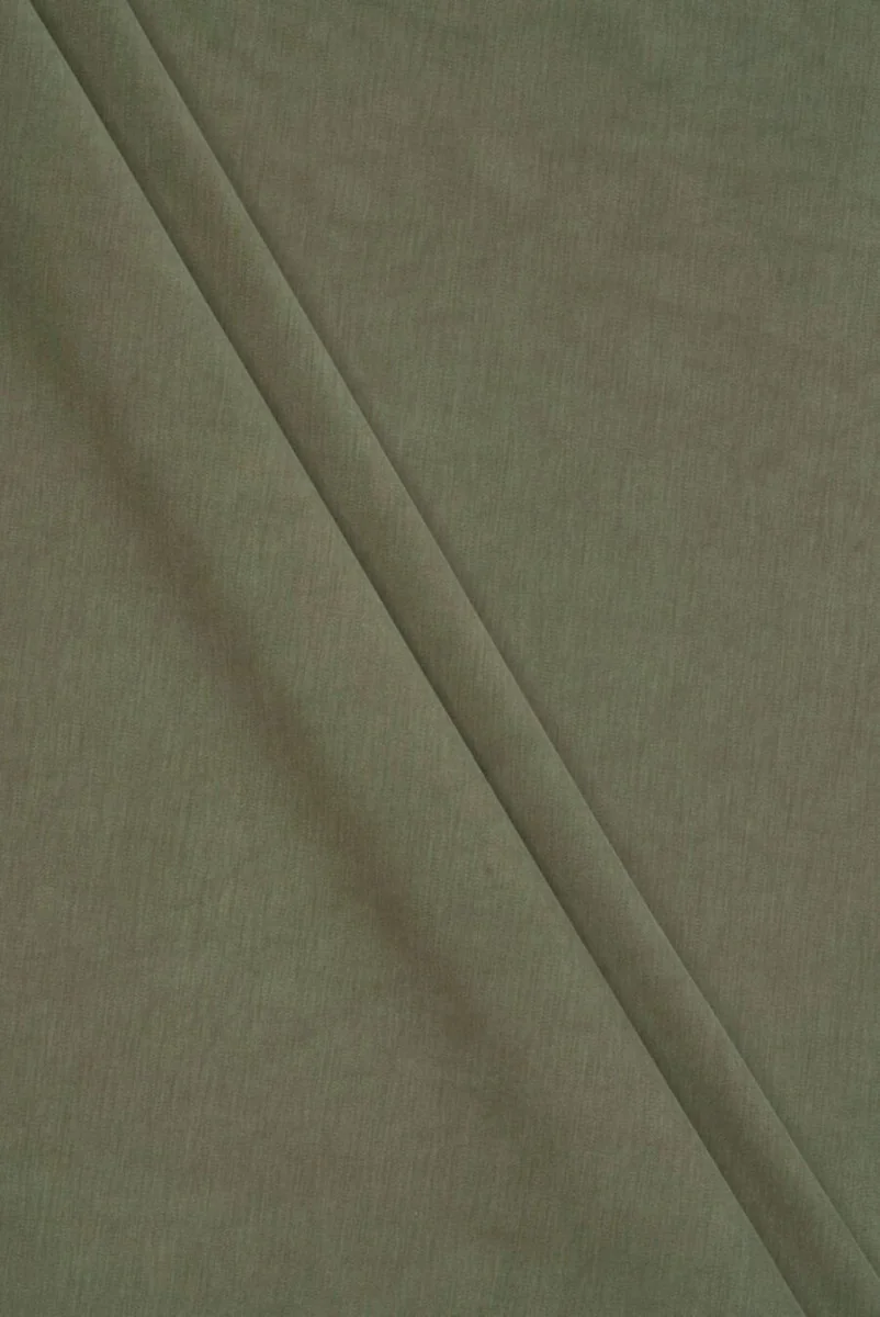 Cupro trikotāžas audums zaļā olīvu krāsā, kas austs no kokvilnas, poliestera un elastāna maisījuma. Materiāls ir mīksts, smags, plūstošs, elastīgs un ļoti patīkams satvēriens. Tas ir ideāli piemērots kleitām, svārkiem, blūzēm, kombinezoniem.