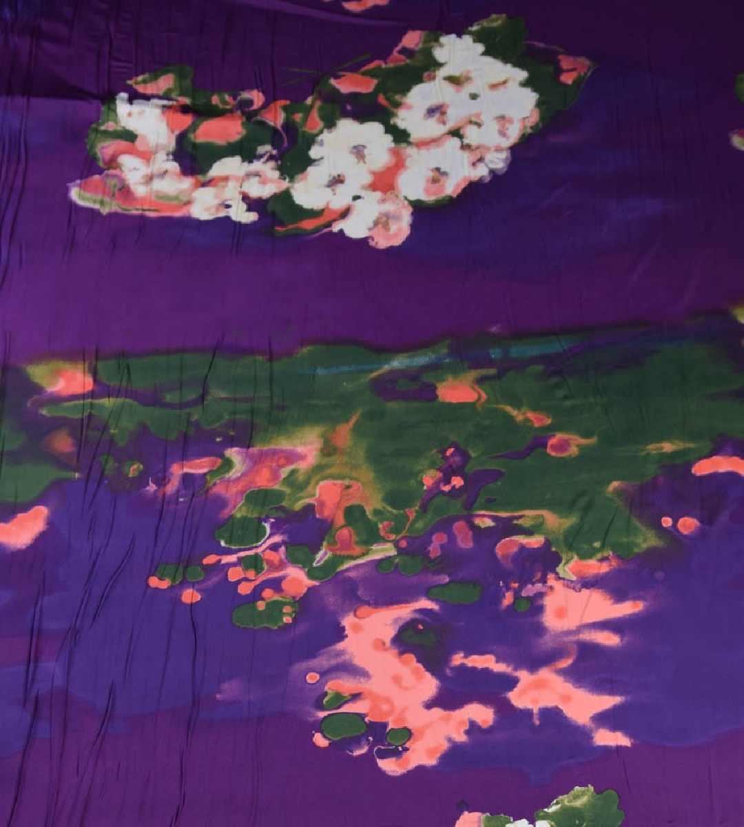 Itāļu viskozes trikotāžas audums purpura krāsā ar ziedu motīvu, audums ir kupona izmērā 115 cm * 140 cm. Slidena - dzesēšanas tipa trikotāžas audums.