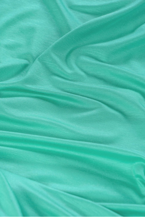 Itāļu viskozes trikotāžas audums gaiši zaļā tirkīza krāsā - ļoti laba kvalitāte. Maigs uz tausti, elastīgs ar nelielu spīdumu. Lieliski piemērots blūzes vai t-krekla šūšanai.