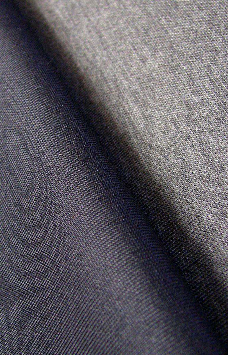 Divpusējs viskozes trikotāžas audums. Vidēji biezs, elastīgs audums. Viena puse ir tumši zila, otra puse ir pelēka melange. Ideāli piemērots kleitām un svārkiem.