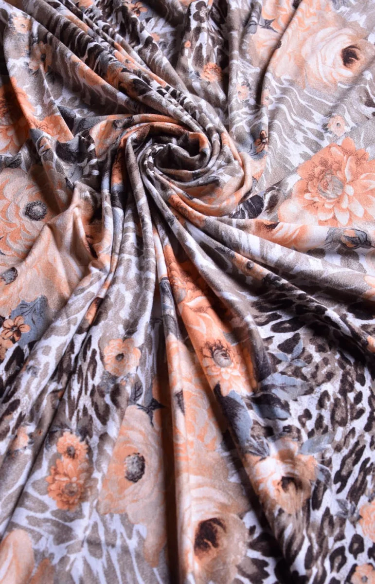 Plāns, elastīgs trikotāžas audums ar oriģinālu apdruku - leoparda apdruka ar laša ziediem. Trikotāža ir lieliski piemērota blūzēm, plānām kleitām vai T-krekliem.